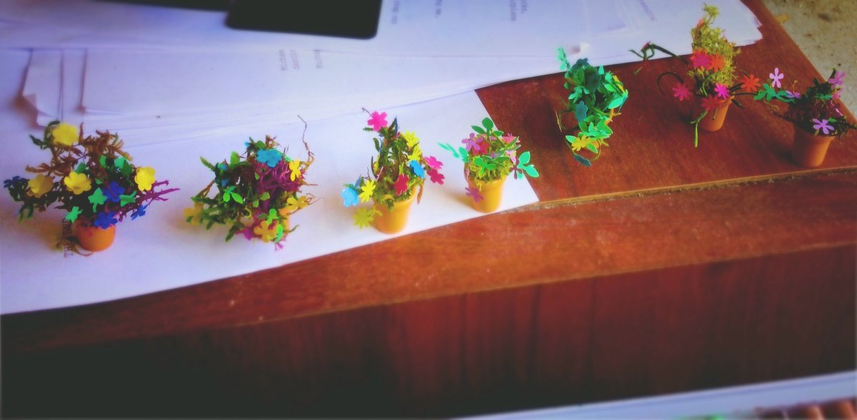 Miniature paper flowers in miniature flowerpots, made for Mother's Day a few years ago.